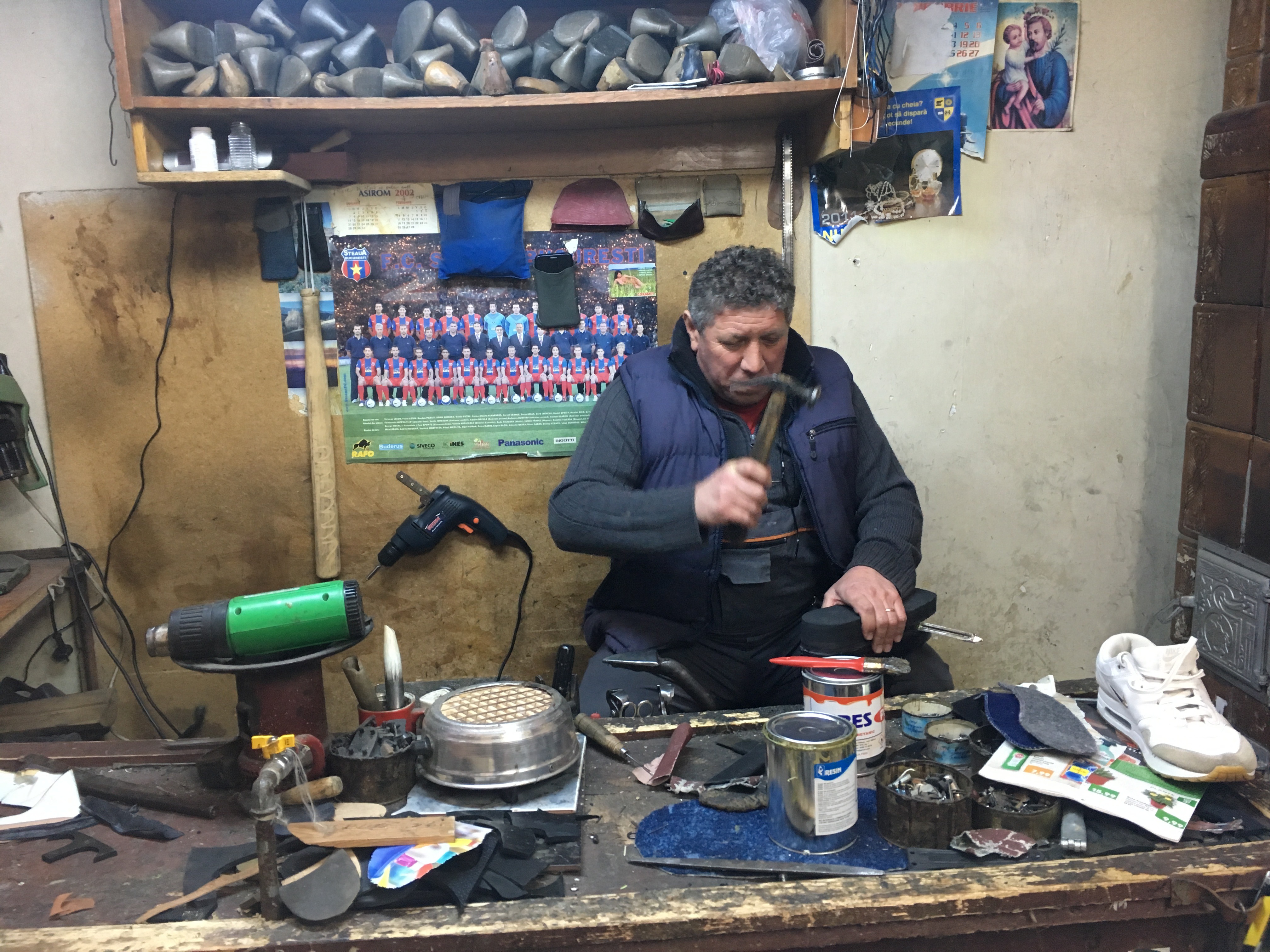 Un astfel de loc este pe strada Horea, aproape de gara din Cluj. Lipit de un bar cu păcănele, într-o încăpere în care faci practic o călătorie în timp, funcționează încă un atelier de reparat pantofi. Omul de dincolo de tejgheaua care și-a pierdut demult luciul lucrează aici de 33 de ani. A încărunțit reparând tălpi și pingele, lipind tălpi și înlocuind fermoare, dar spune că n-ar renunța nicicând la ce face.