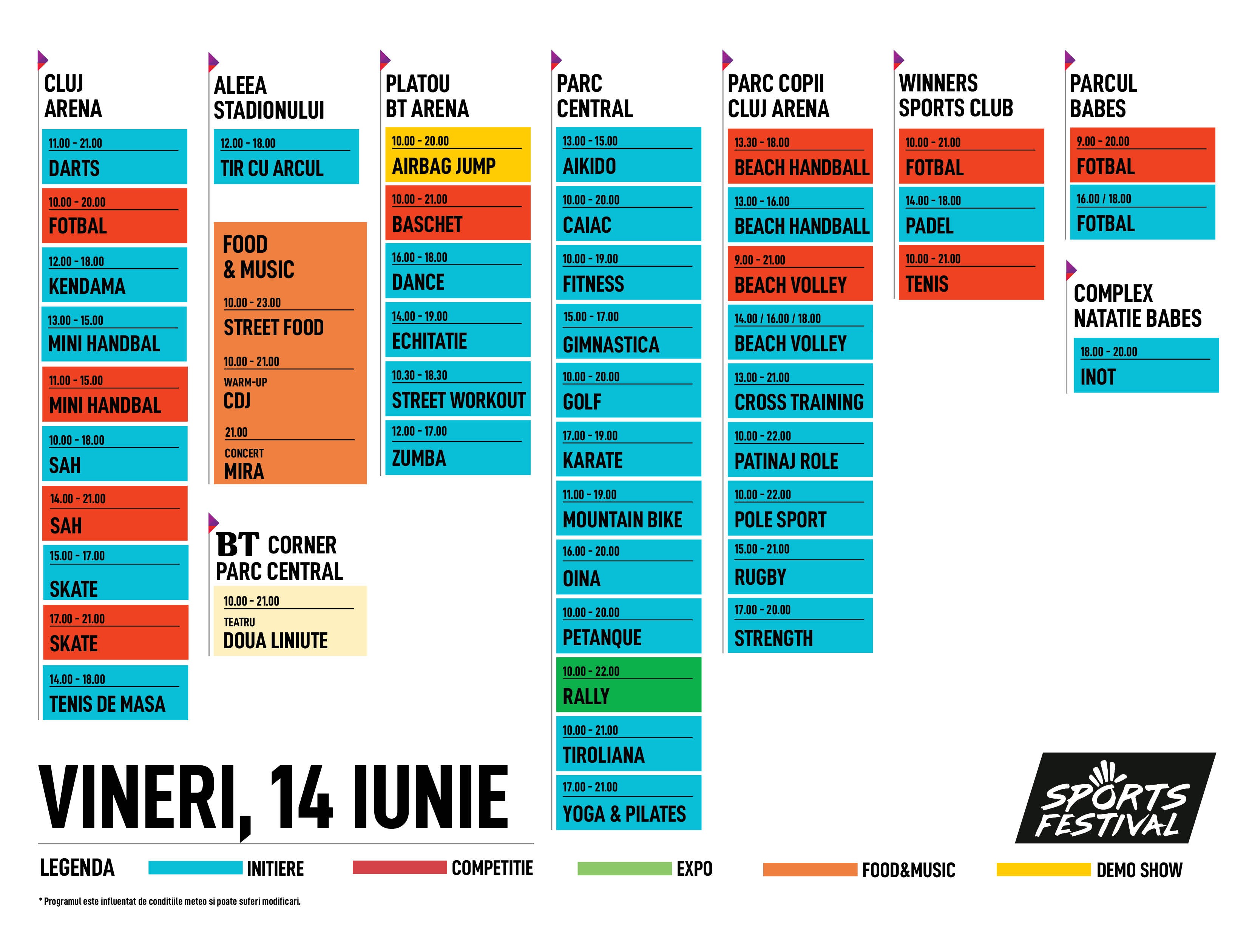 Oamenii vor porni în paradă din parc până pe platoul Cluj Arena unde se află scena principală a festivalului. Va urma un show cu demonstrații sportive spectaculoase, unele în premieră pentru România. Artiștii invitați sunt din UK, Germania, Serbia, Italia, Austria, Republica Moldova. Seara se va încheia cu concertul Mira. Intrarea este liberă.