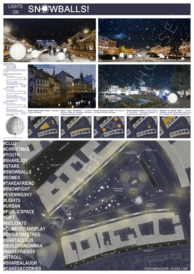 Proiectul câștigător, „Snowballs” propus de Diana Siminic și Barbu Precup implică decorarea Pieței Mihai Viteazu cu sfere albe luminoase, dar și cu alte ornamente.