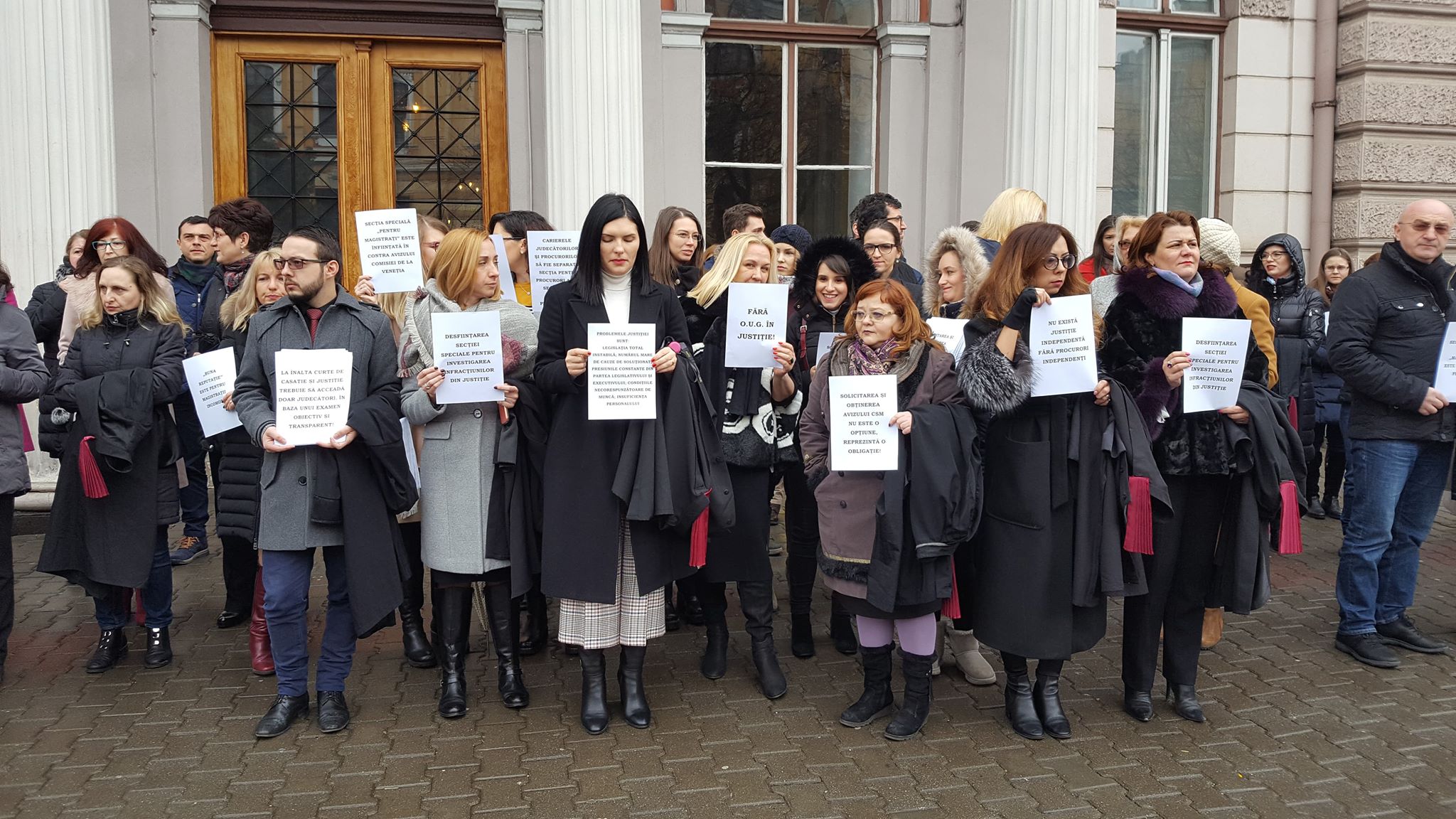 Circa o sută de magistrați clujeni au protestat timp de 30 de minute în această dimineața față de adoptarea OUG 7/2019. La protest au participat judecători și procurori în funcție, inclusiv procurori DNA și DIICOT, dar și auditori de justiție trimiși la Cluj de Institutul Național al Magistraturii.