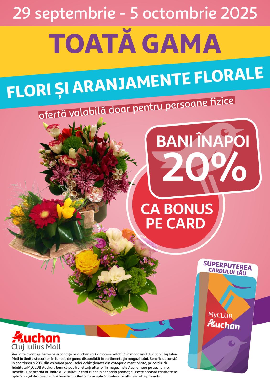 Până pe 5 octombrie 2025, clienții MyCLUB Auchan primesc 20% bani înapoi ca bonus pe cardul de fidelitate pentru toată gama de flori și aranjamente florale.