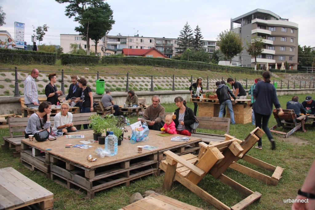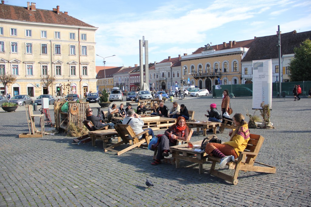Anul acesta, asociația noastră, www.urbannect.ro a derulat un proiect, care a dorit să continue o idee pe care am pus-o în practică încă de anul trecut. În octombrie 2014 am propus clujenilor un Living Urban construit din paleți refolosiți care era amplasat în mijlocul Pieței Unirii. Acesta propunea transformarea în mentalitatea trecătorilor a spațiului public al orașului în propriul cămin. Pentru că orașul este propriul nostru cămin, al tuturor. Am zăbovit atunci trei zile în piață servind ceai celor care găseau naturalețea gestului de a se așeza și de a sporovăi cu ceilalți concitadini ai lor/ai noștri pe mobilierul de Acasă. Din Orașul Acasă.