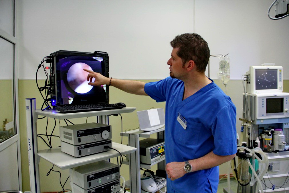 „Artroscopia reprezintă o tehnică modernă de abordare a articulațiilor la cal, câine sau pisică, iar la noi este utilizată acum pentru prima oară pe cazurile clinice. Realizarea acestui tip de chirurgie minim invazivă la animale este o premieră, deoarece până acum intervențiile articulare se făceau cu deschidere clasică, cu o incizie mai mare care ducea la spitalizare destul de îndelungată, costuri mai mari și recuperare mai lentă a pacienților. Artroscopia vizează două micro incizii la nivelul articulațiilor, metodă net avantajoasă deoarece recuperarea pacienților este mult mai rapidă comparativ cu operația clasică, spitalizarea este mult mai scurtă și costurile legate de medicamentația post operatorie sunt iarăși mult mai scăzute. Săptămâna trecută doctorul Günter Schwarz a abordat două cazuri dificile cu displazie de cot, aceasta fiind una dintre cele mai frecvente afecțiuni ortopedice la câine care se poate remedia prin această tehnică”, explică medicul Ciprian Ober.