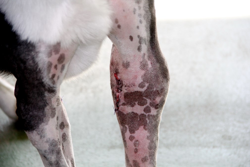 Intervenția în cazul cățelușei Braga a necesitat, pe lângă cele două micro incizii și o incizie suplimetară pentru a ca medicul să poată scoate toate fragmentele din os care s-au format în urma cronicizării afecțiunii / Foto: Dan Bodea