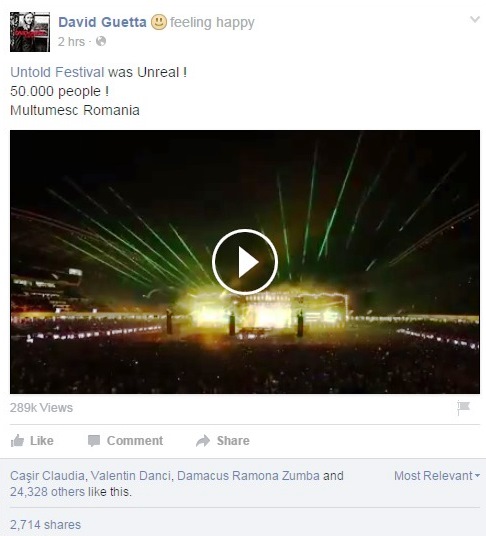 David Guetta, unul dintre cei mai așteptați artiști ai primei ediții Untold Festival, nu și-a dezamăgit fanii, oferindu-le și de această dată un show electrizant. Aflat a treia oară în România, dar pentru prima dată la Cluj, acesta a fost impresionat de atmosfera de pe Cluj Arena. „Sunt pentru prima dată aici. Sunteți minunați” a spus celebrul DJ în momentul în care a urcat pe scenă și a văzut stadionul arhiplin. Acesta a postat pe 4 august un filmuleț din timpul concertului însoțit de mesajul: „Untold Festival was Unreal ! 50.000 people ! Mulțumesc România”.
