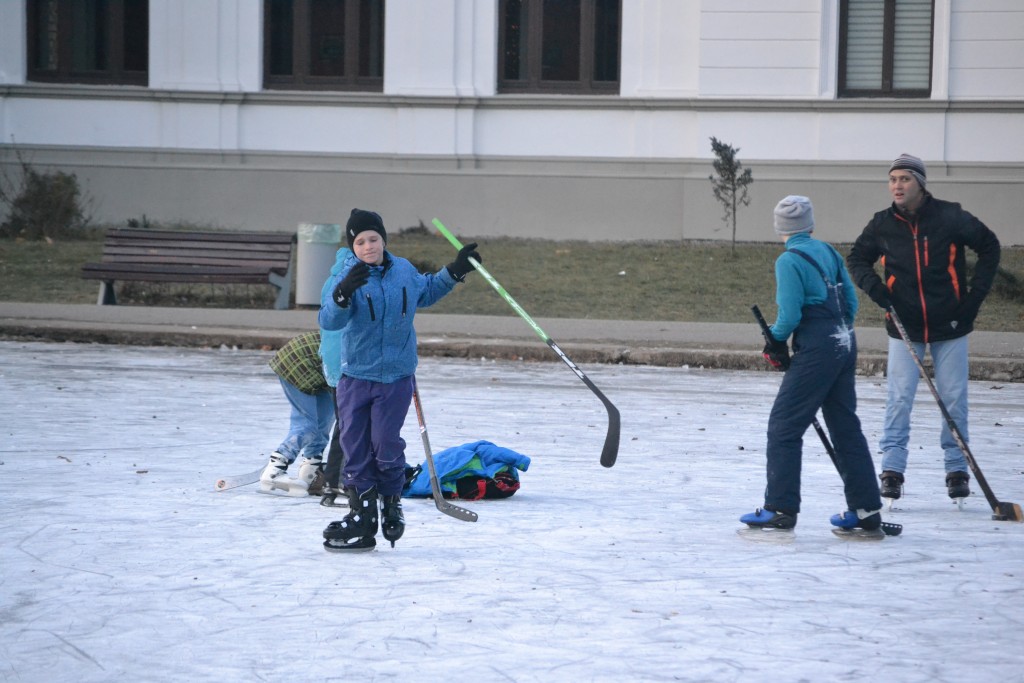 În mijlocul patinoarului, joaca e în toi. Sunt și mulți „cursanți” susținuți și sfătuiți de părinți pentru a nu-și pierde echilibrul în timpul primelor lecții.