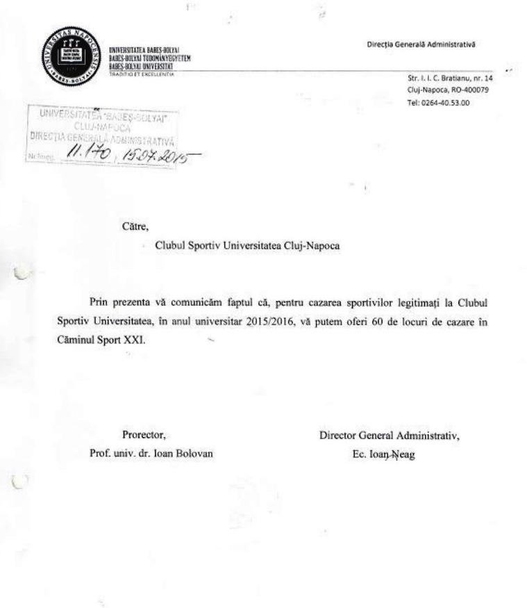 Adresa trimisă de către Direcția Generală Administrativă a UBB către Clubul Sportiv Universitatea, în data de 15 iulie 2015.
