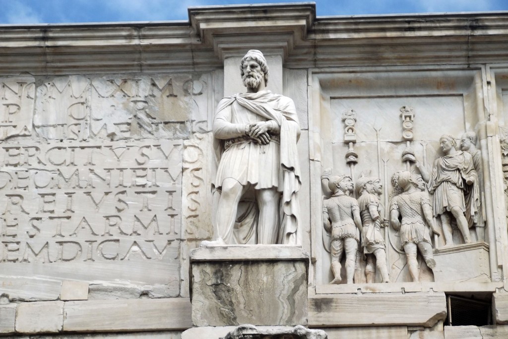4. Arcul lui Constantin este amplasat imediat lângă Colosseum. Opt statui de daci se găsesc pe cele două fațade ale acestuia. Inaugurat în 315, acest arc a fost ultimul din seria marilor arcuri de triumf ale Romei antice. Dar Roma nu mai era ce a fost, și asta se vede și din felul în care a fost construit arcul, refolosind bucăți din monumente romane mai vechi. Și cei opt daci provin dintr-o construcție anterioare, respectiv din Forul lui Traian.