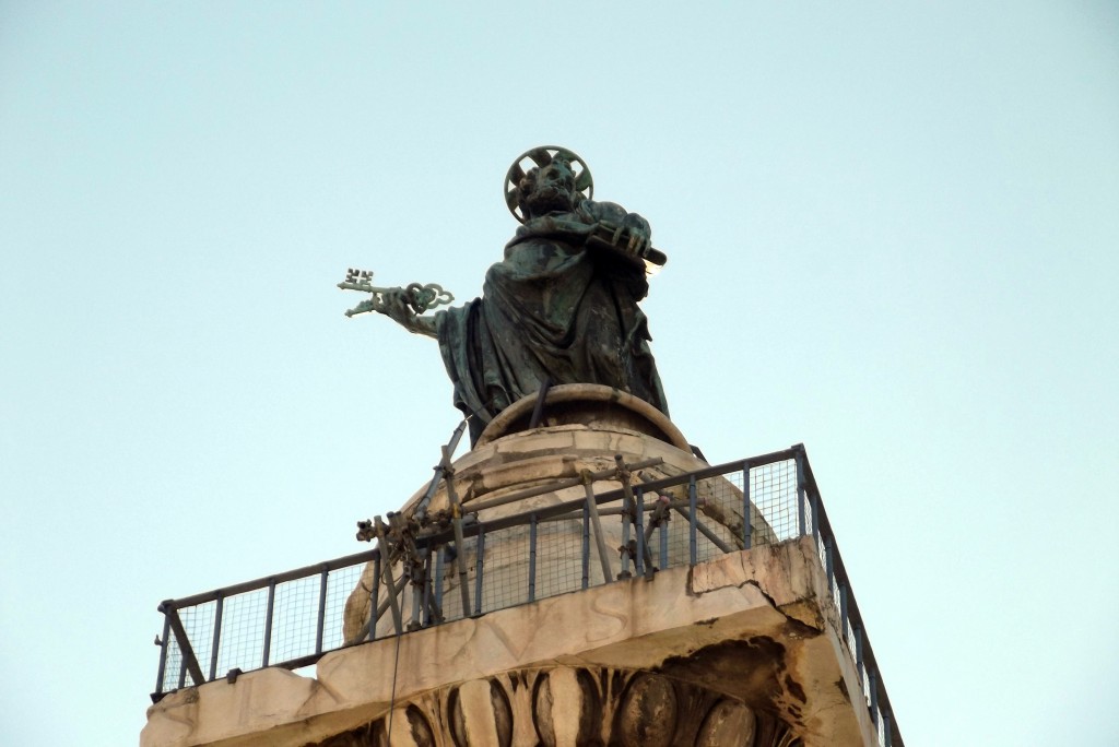 7. Primul Papă, Sfântul Petru, veghează centrul istoric a Romei, din vârful Columnei lui Traian. Statuia orginală a împăratului roman, realizată din bronz și înaltă de 4, 8 metri, a fost înlocuită în 1588 cu statuia actuală. Columna, înaltă de 38 de metri, este amplasată în inima Cetății Eterne, ca încununare a întregului For al lui Traian – de fapt o extindere, înfrumusețare și „modernizare” urbanistică a centrului Cetății Eterne, realizată cu banii obținuți în urma cuceririi Daciei.