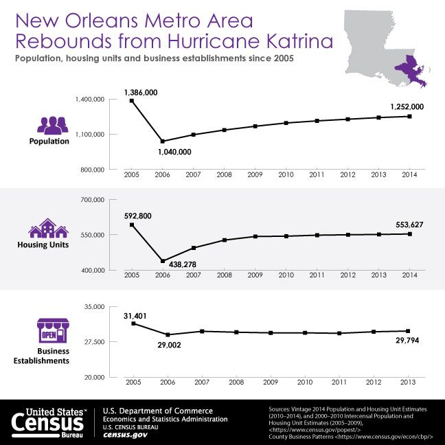 Acest grafic arată clar faptul că oraşul New Orleans încă nu şi-a revenit, în cei 10 ani care au trecut de la fatidicul august 2005. Populaţia, numărul caselor şi cel al afacerilor nu sunt încă la nivelul celor din 2005.